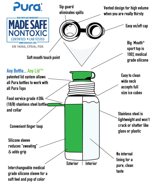 Since 2008, Pura Stainless has been pioneering the concept of a bottle that is 100% PLASTIC FREE, making it truly unique in the world. With Pura, you can say goodbye to the concerns of microplastic contamination and the release of toxic substances into your beverages. Our bottles are made from high-quality 18/8 food-grade stainless steel and premium medical-grade silicone, guaranteeing safety and durability.