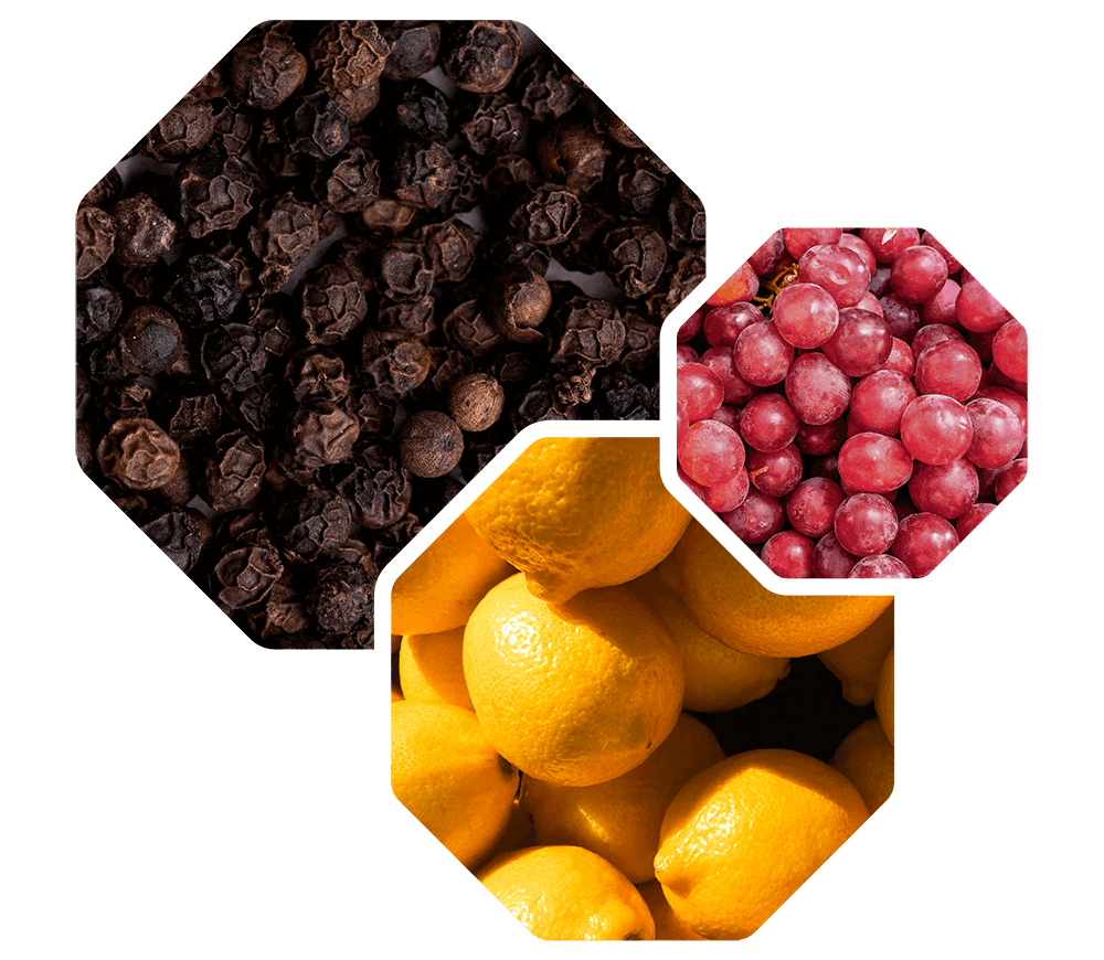 Black Pepper, Lemon, Orange, Grape, Pink Pepper